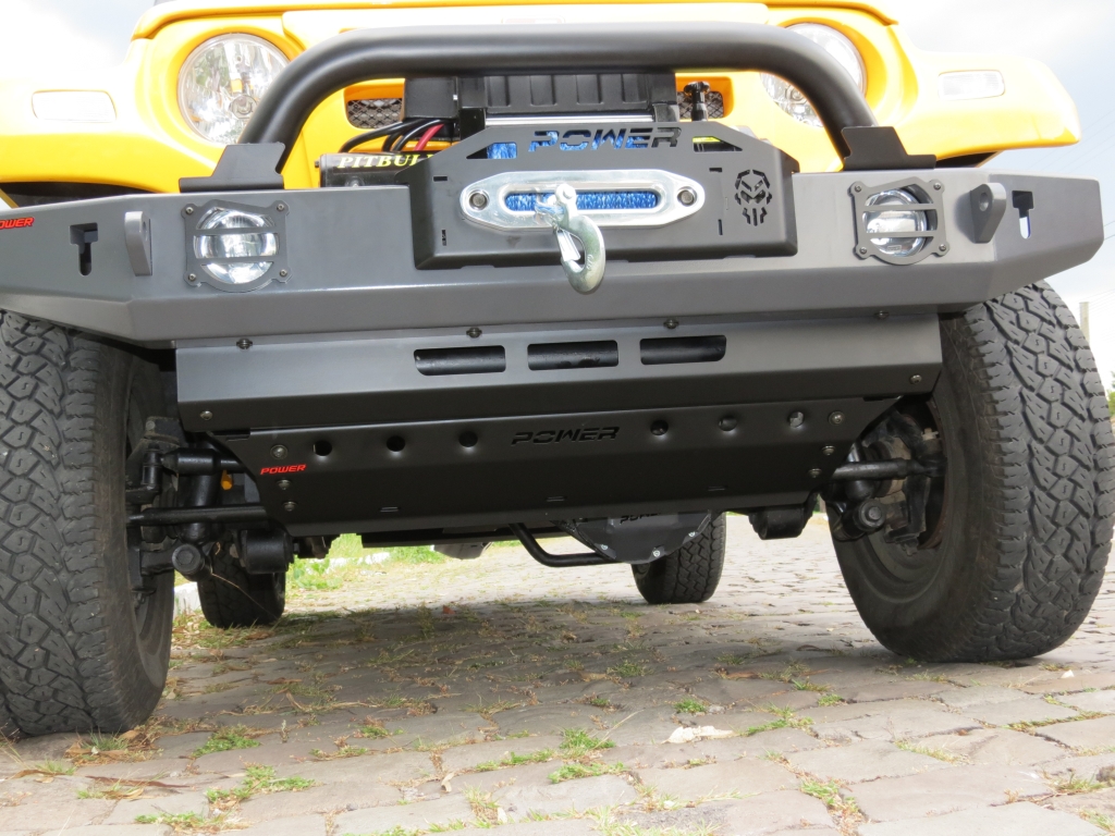 O peito de aço protege a caixa de direção e barras dos obstáculos comuns em trilhas. Fabricado em chapa de 4,75 mm e suportes em chapa de 6,35 mm, possui reforço extra para evitar o empenamento.